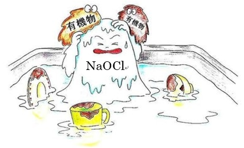 次亜塩素酸ナトリウムは細菌芽胞にも有効な消毒薬で、過酢酸(アセサイド®)などの高水準消毒薬と同様に広範囲抗菌スペクトルを示します。しかし、次亜塩素酸ナトリウムは中水準消毒薬に分類されています。この理由は、次亜塩素酸ナトリウムは有機物(汚れ)が存在すると急速に効力がなくなるからです(イラスト)1,2)。次亜塩素酸ナトリウム(NaOCl)は汚れと反応すると食塩(NaCl)になります。